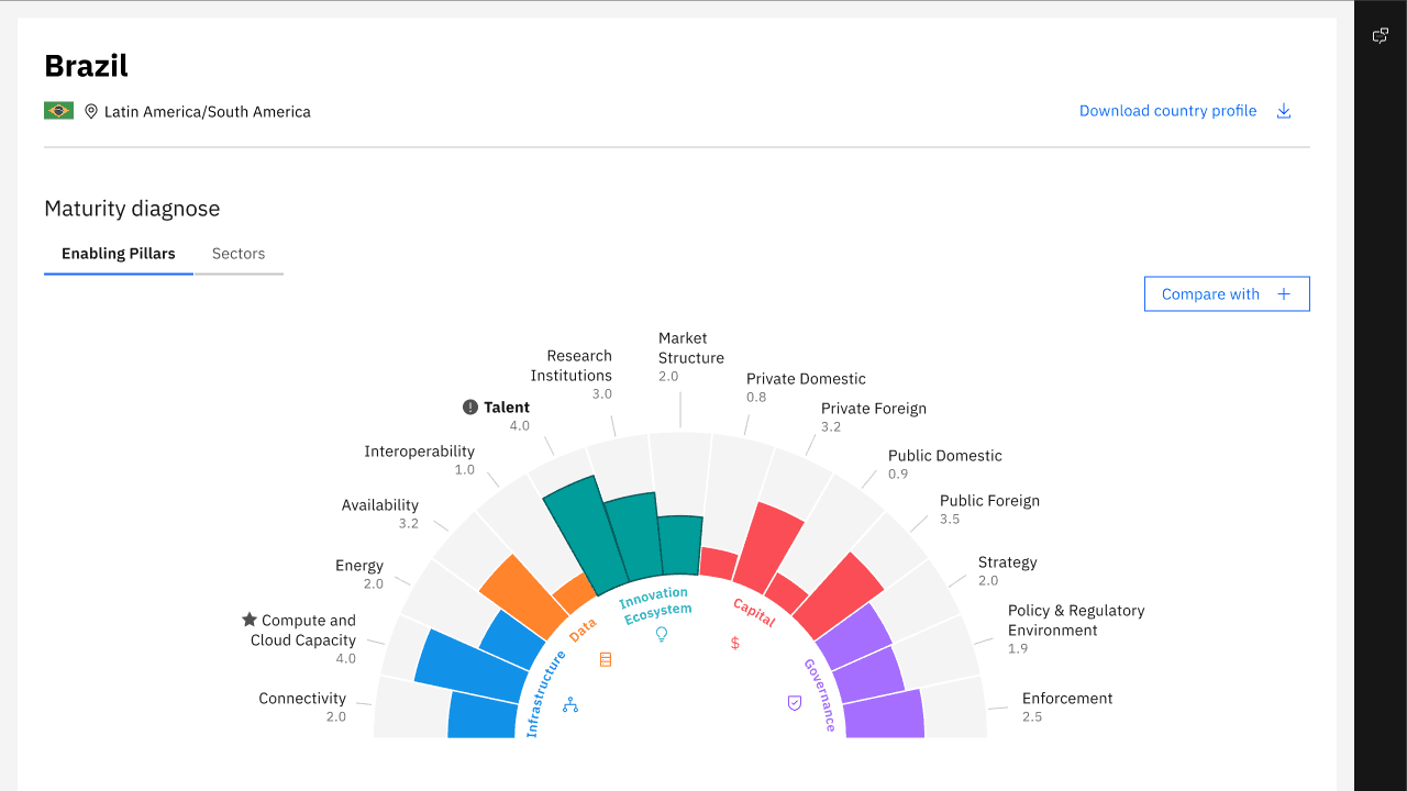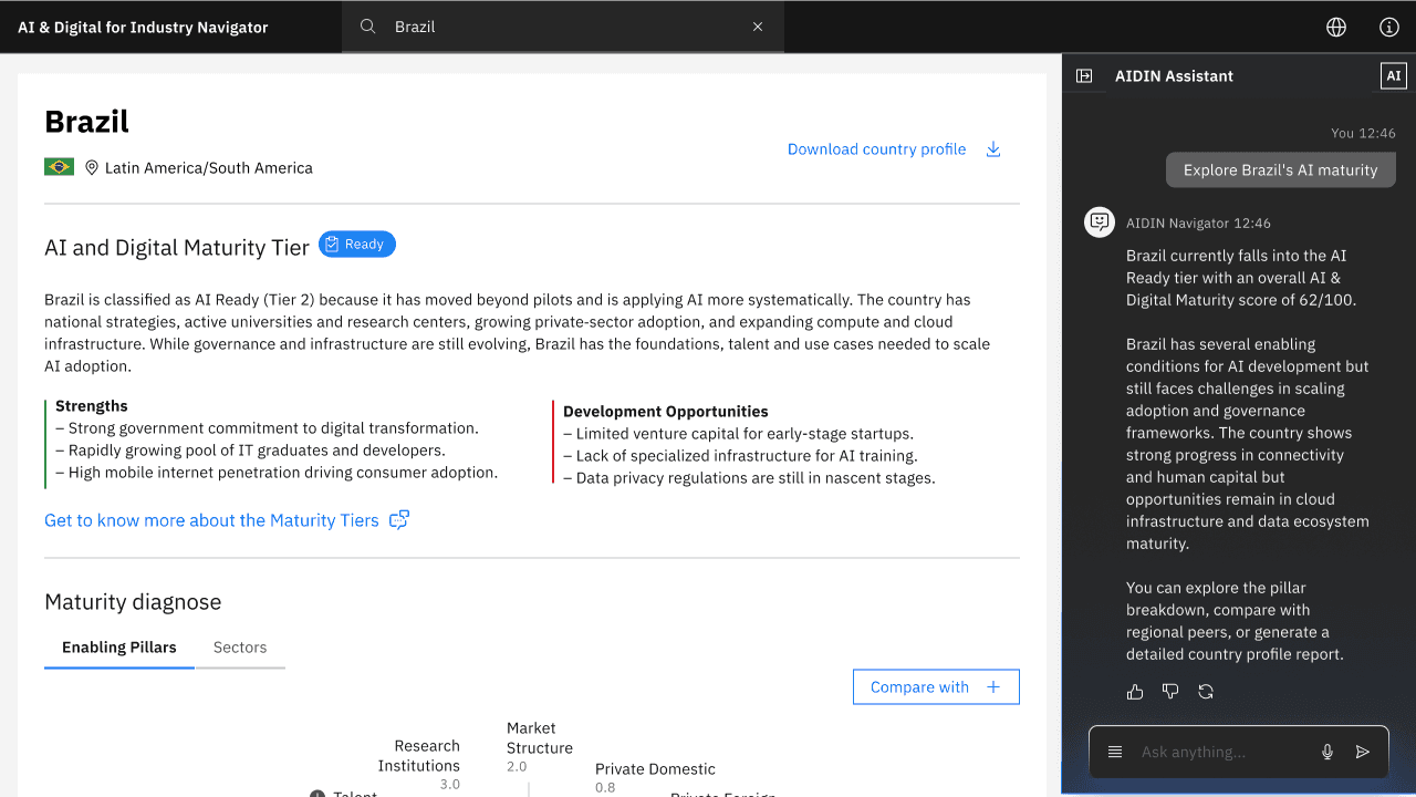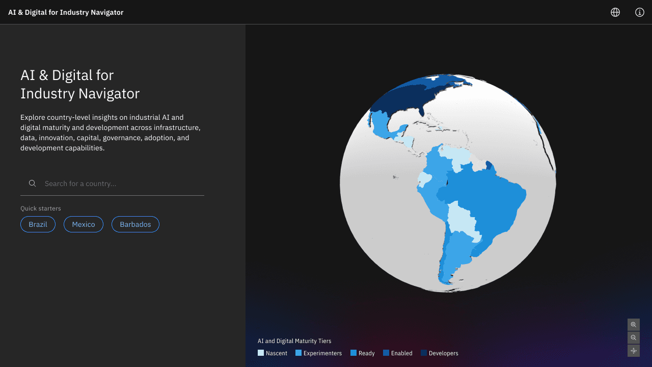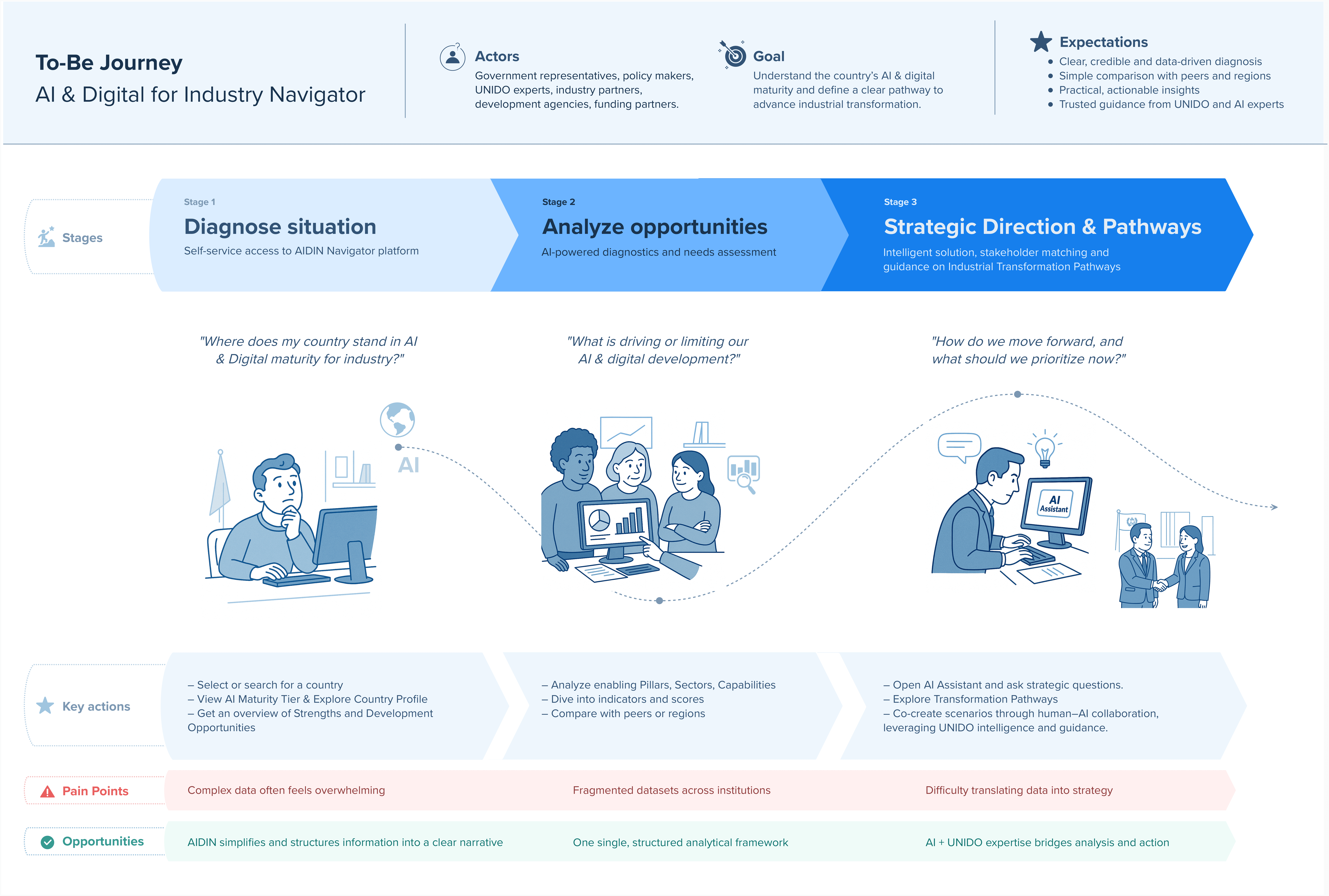 Over 4 months, our cross-functional team conducted 14 user interviews with participants from Brazil, Mexico, China, Austria, and industry partners, plus Design Thinking workshops and technical alignment sessions engaging 30+ stakeholders in total. From that research, we mapped 5 distinct personas, each with a different relationship to data, a different vocabulary, and a different definition of "actionable." The pain points were consistent across all of them: data too complex to trust, fragmented datasets with no interoperability, and a fundamental disconnect between analysis and strategy. That gap shaped the entire design. Rather than jumping to UI, I led the team in defining a journey through three stages that mirror how real decision-making works: diagnose where your country stands, analyze what's driving or limiting development, and act on AI-generated transformation pathways co-created with UNIDO's institutional knowledge. The MVP brings all three stages into a single platform: an interactive globe visualizing maturity tiers across countries, a structured country profile with scoring across 68+ indicators, and an AI Assistant for exploring transformation scenarios through natural conversation. The framework was developed with Oxford Insights across 5 enabling pillars and 17 dimensions of industrial AI readiness.